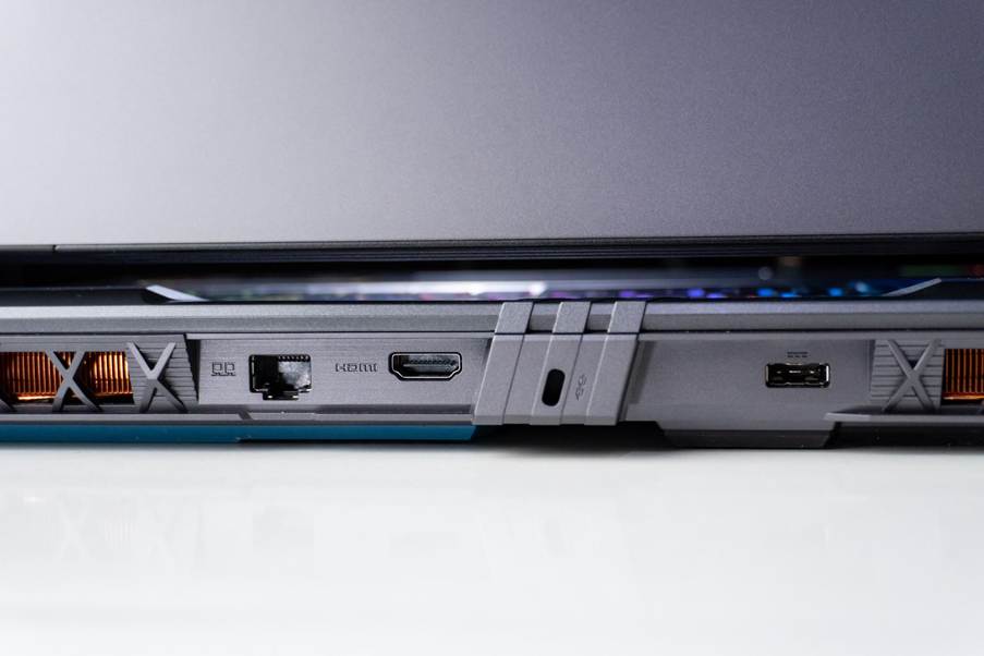 Ở phía sau là nơi chứa cổng cấp nguồn, cổng HDMI 2.1 và cổng mạng RJ45. Khá thú vị khi máy có cả khóa Kensington.