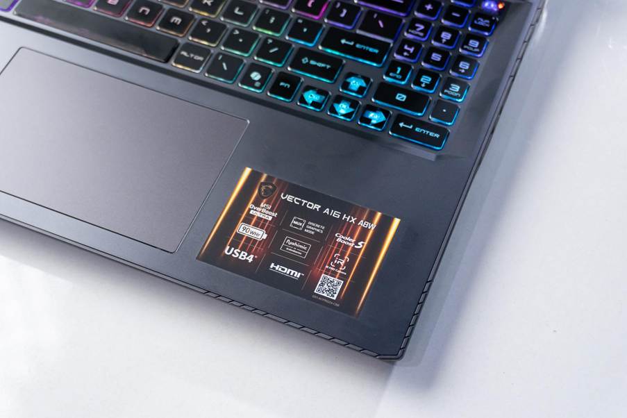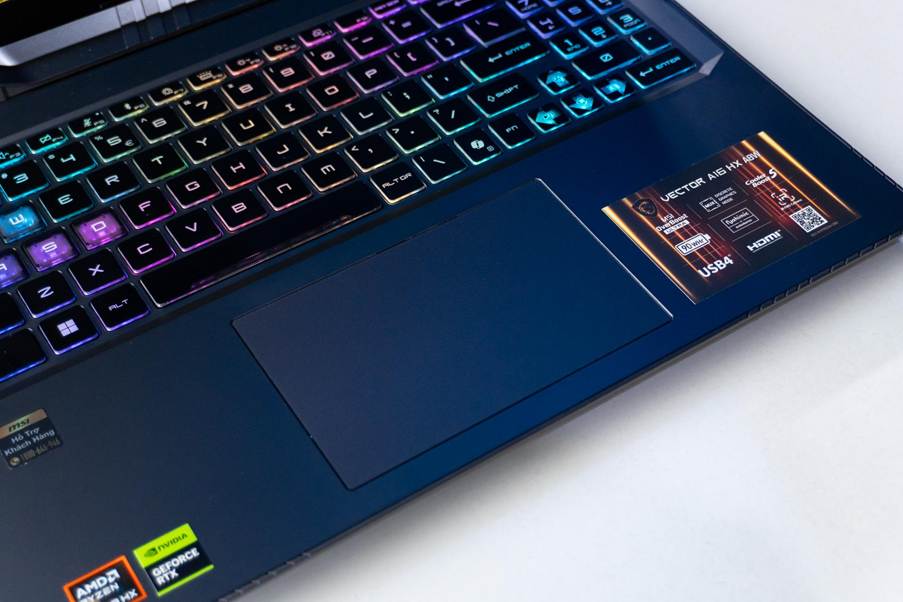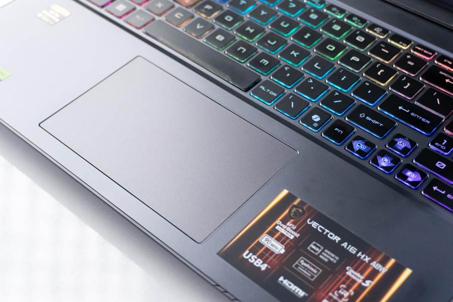 MSI Vector A16 HX A8WHG được trang bị bàn phím full size với đèn nền RGB 24 vùng. Hệ thống đèn nền RGB 24 vùng được thiết kế tinh tế, tạo hiệu ứng chuyển màu mượt mà không kém các mẫu RGB per key cao cấp.