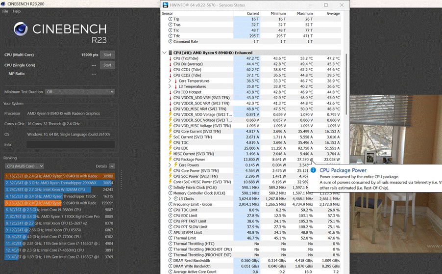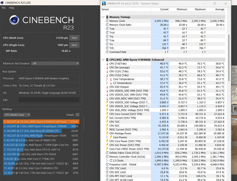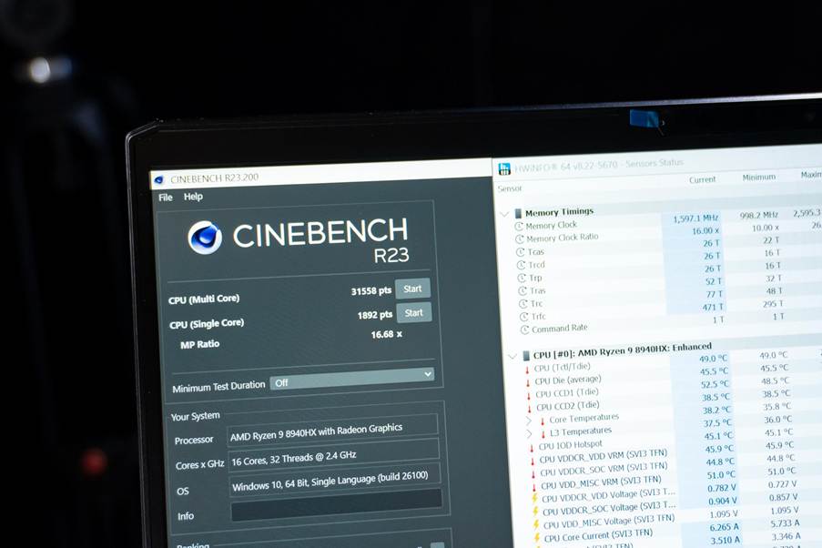 Đầu tiên chúng ta sẽ đến với các thử nghiệm hiệu năng quen thuộc. Trong Cinebench R23 khi cắm sạc, với mức TDP tối đa 102W, Ryzen™ 9 8940HX đạt số điểm đa nhân vô cùng ấn tượng, khoảng 31,500 điểm. Để so sánh thì phiên bản Intel của MSI Vector A16 HX với Core Ultra 7 255HX chỉ đạt ~26,000 - 27,000 điểm trong khi đó công suất có thể đạt tới 160 - 170W. Như vậy chỉ qua bài test đầu tiên có thể thấy cấu hình AMD thực sự tối ưu hơn rất nhiều.