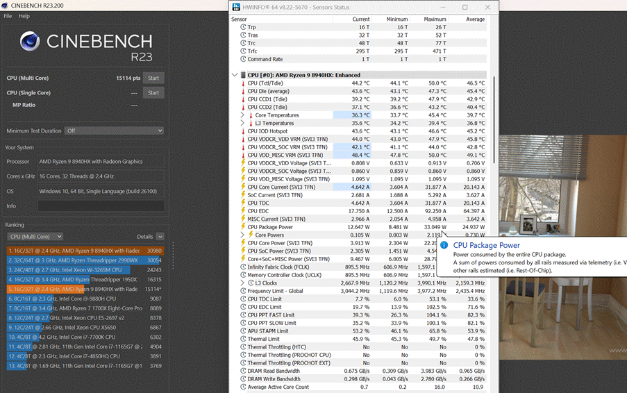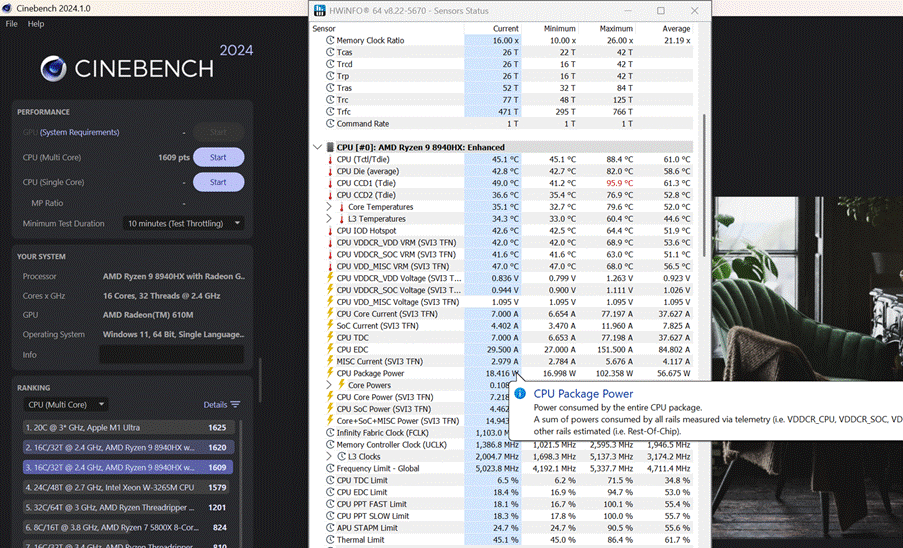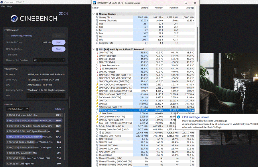 Khi không cấp nguồn, AMD Ryzen™ 9 8940HX vẫn vượt mốc 1000 điểm Cinebench 2024, một số điểm rất cao với công suất chỉ 37W