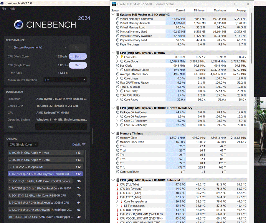 Nhắc lại một chút về cấu hình MSI Vector A16 HX A8WHG, máy đang được trang bị chip AMD Ryzen™ 9 8940HX, một con chip 16 nhân 32 luồng sử dụng kiến trúc Zen 4 với công suất tối đa chỉ 102W.