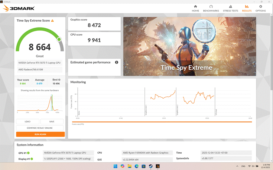 RTX 5070 Ti trên MSI Vector A16 HX A8WHG có TGP 140W và nó thực sự có thể duy trì ổn định ở mức khoảng 135 - 140W khi chơi game. Trong bài test Ray Tracing (3DMark Speedway), nó thể hiện sức mạnh vượt trội so với thế hệ trước cũng như khi so với RTX 5060.