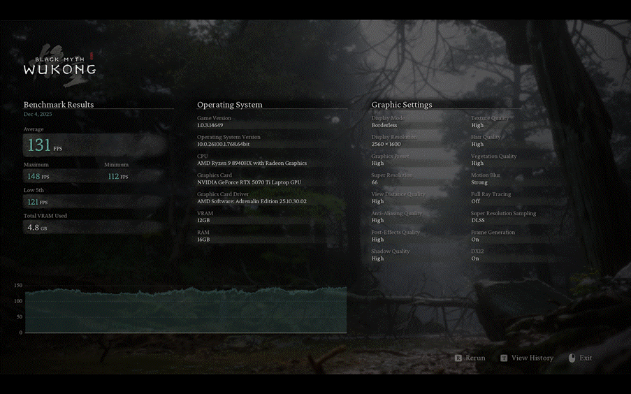 Với Black Myth: Wukong (2K+, High, FG on, RT off), mức fps đạt được là 131, đủ để chơi mượt với mức minimum 112