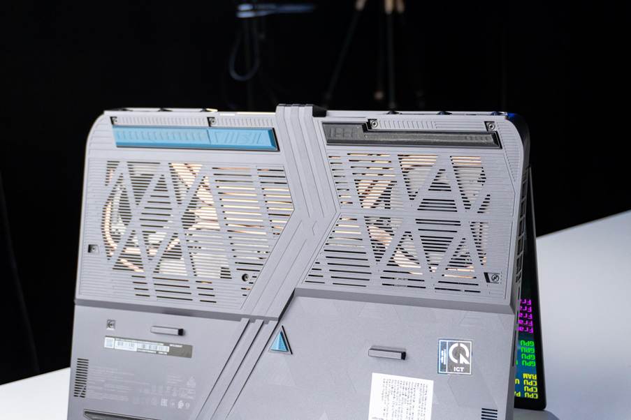 Mặt đáy của máy là hệ thống khe hút gió rất lớn, để lộ gần như toàn bộ hệ thống quạt tản nhiệt và ống đồng bên trong.