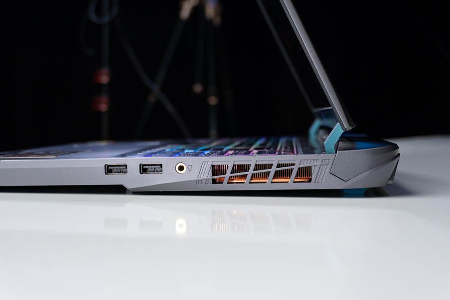 Về cổng kết nối, Vector A16 HX A8WHG được trang bị khá đầy đủ các kết nối cần thiết. Ở bên cạnh phải chúng ta sẽ có 2 cổng USB 3.2 Type-A và một jack âm thanh 3.5mm.